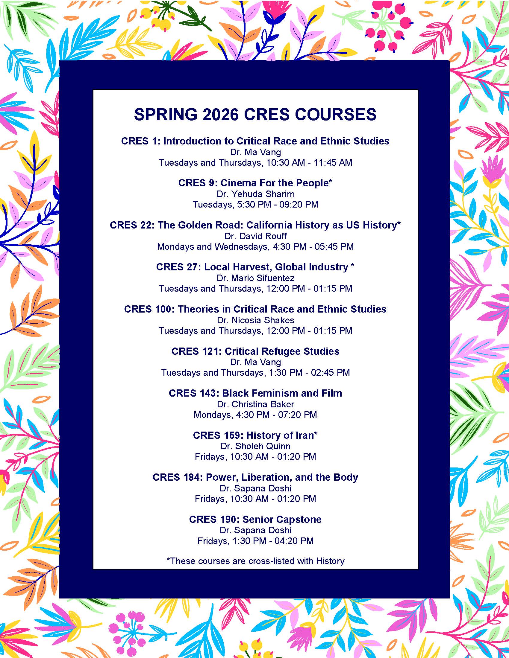 Below is a list of our Spring 2026 undergraduate course offerings. For more information on instructors and meeting times and places, please click on the link here, and then choose which semester you would like to view, Critical Race and Ethnic Studies as the subject, and either 'Open' or 'All Classes.'